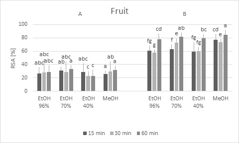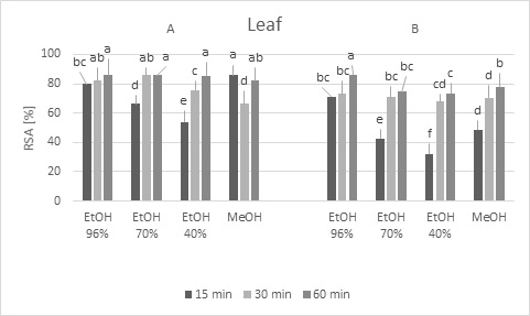 Materials and methods: Antioxidative activity was measured by 2,2-diphenyl-1-picrylhydrazyl (DPPH) and 2,2’-azino-bis(3-ethylbenzothiazoline-6-sulfonic acid) – ABTS methods, and total polyphenol content by Folin–Ciocalteu technique. Extracts in 40%, 70% and 96% (v/v) of ethanol as well as 99.8% (v/v) methanol were used. Ultrasound-assisted extraction was applied for 15, 30 and 60 min.