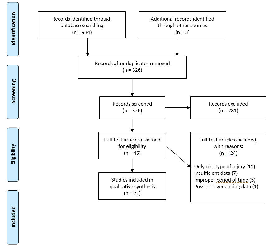 Materials and methods: The available electronic databases were searched for papers concerning pediatric trauma admissions, referrals, and visits during the coronavirus outbreak and in the previous year. The quality of included papers was assessed via National Institutes of Health National Heart, Lung, and Blood Institute (NIH NHLBI) Study Quality Assessment Toolbox.